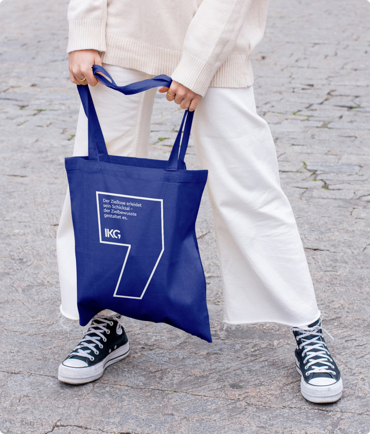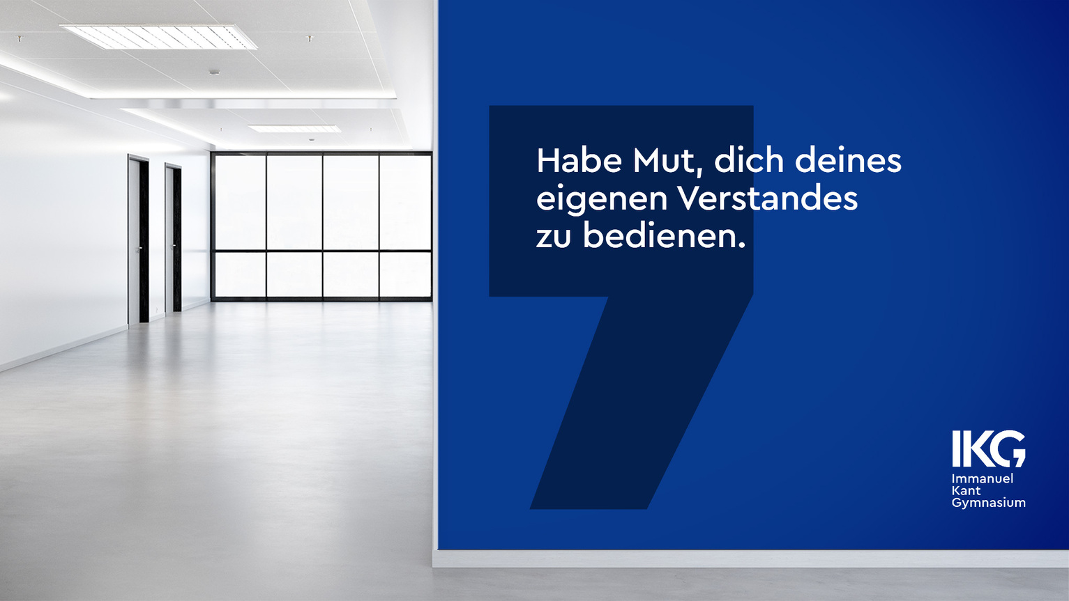 Am Immanuel Kant Gymnasium steht der Namensgeber im Zentrum der Gestaltung. Kants prägnante Philosophie der Aufklärung haben wir in ein reduziertes Logo integriert: Ein Anführungszeichen in der Abkürzung »IKG« verweist auf seine beeindruckenden Aussagen und formt ein klares, reduziertes Logo, das sowohl zurückhaltend als auch plakativ auf diversen Anwendungen zum Einsatz kommt.