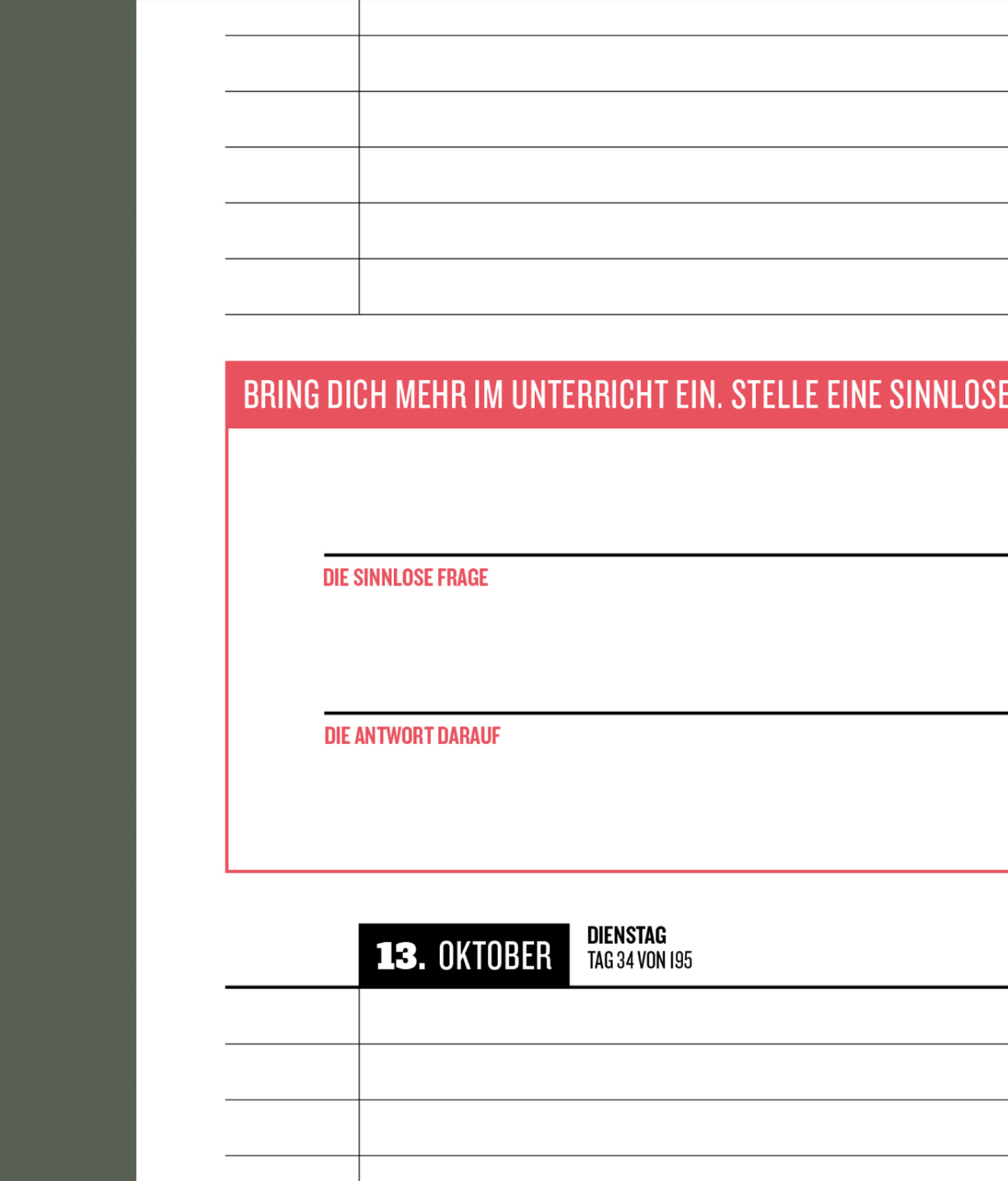 Mit mehr als 200 Seiten haben wir diesen Schulkalender gestaltet, um Schülerinnen und Schüler durch das ganze Schuljahr zu begleiten. Es bietet alles, was man braucht: Stundenpläne, Ferienübersichten und das große Einmaleins. Dazu laden wir dazu ein, kreativ zu werden: kleine Aufgaben, Motivationstipps oder Käsekästchen sorgen für Abwechslung. Alles verpackt in einem modernen, ansprechenden Design. Und das Beste: Jede Schule kann selbst entscheiden, wie das Heft aussehen soll.