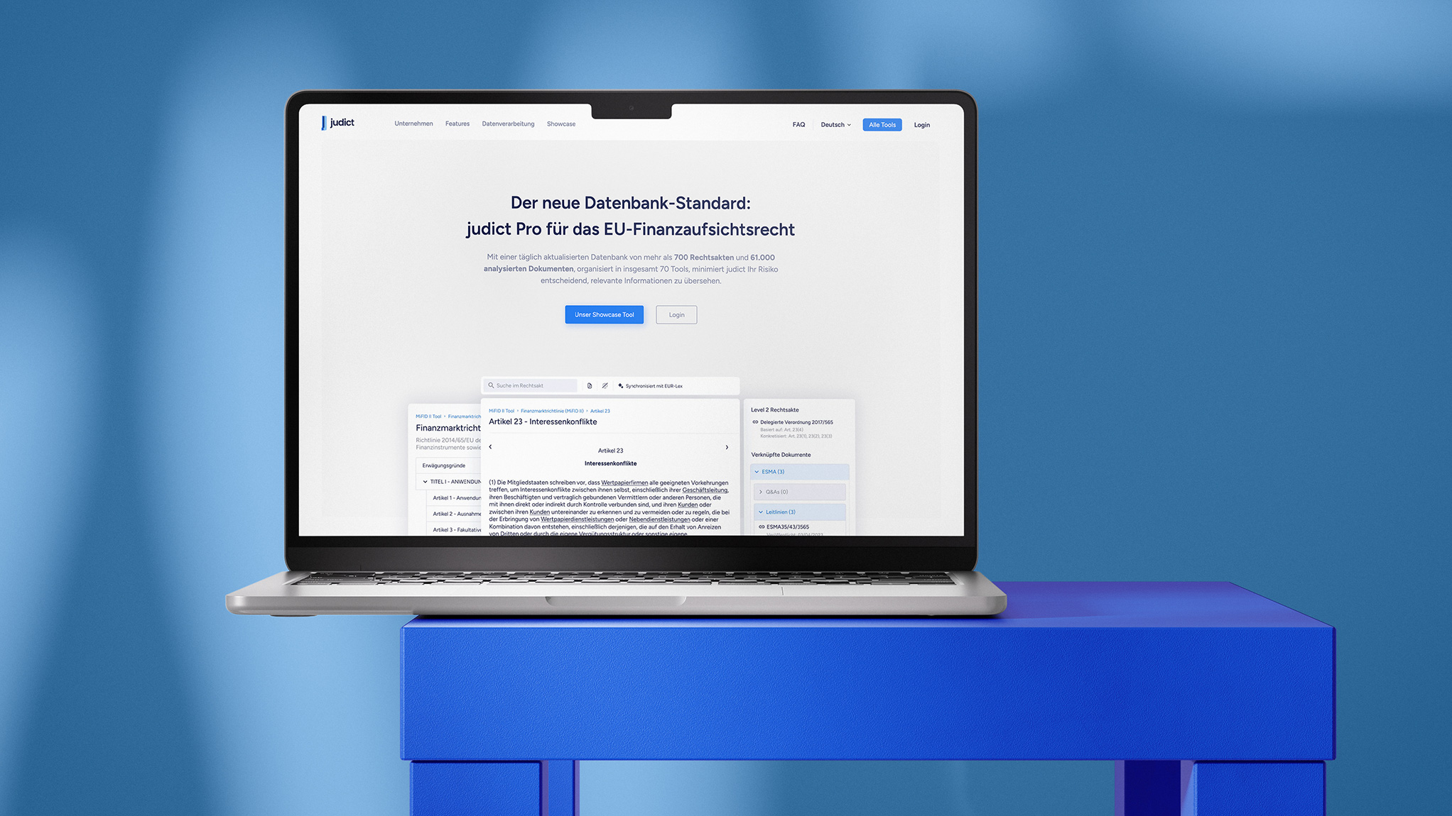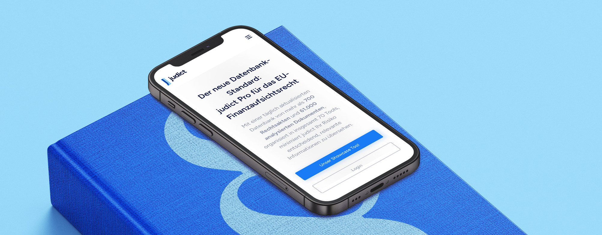 Judict macht das europäische Finanzaufsichtsrecht vollständig digital zugänglich – übersichtlich, webbasiert und jederzeit verfügbar. Unsere Aufgabe war es, dafür die passende Identität zu entwickeln. Entstanden ist eine moderne Marke mit klarer Wiedererkennbarkeit. Zudem haben wir daraus ein flexibles UX-Designsystem abgeleitet, das den kontinuierlichen Ausbau strukturiert und ein durchgehend stimmiges Erscheinungsbild sichert.