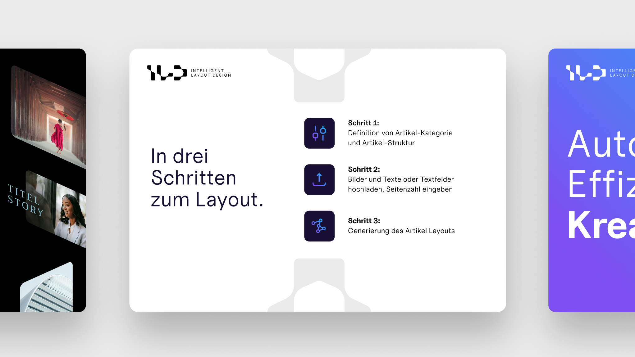 Das Start-Up »Intelligent Layout Design« spezialisiert sich auf die automatisierte Umsetzung von Editorial Design durch künstliche Intelligenz. Vor allem große Verlagshäuser profitieren davon, wiederkehrende Layouts effizient und konsistent umsetzen zu können. Unsere Aufgabe war es, ein Corporate Design zu entwickeln, das die Themen Intelligenz, Zukunft und die Automatisierung von Layout visuell erlebbar macht – klar, modern und mit starkem Wiedererkennungswert.